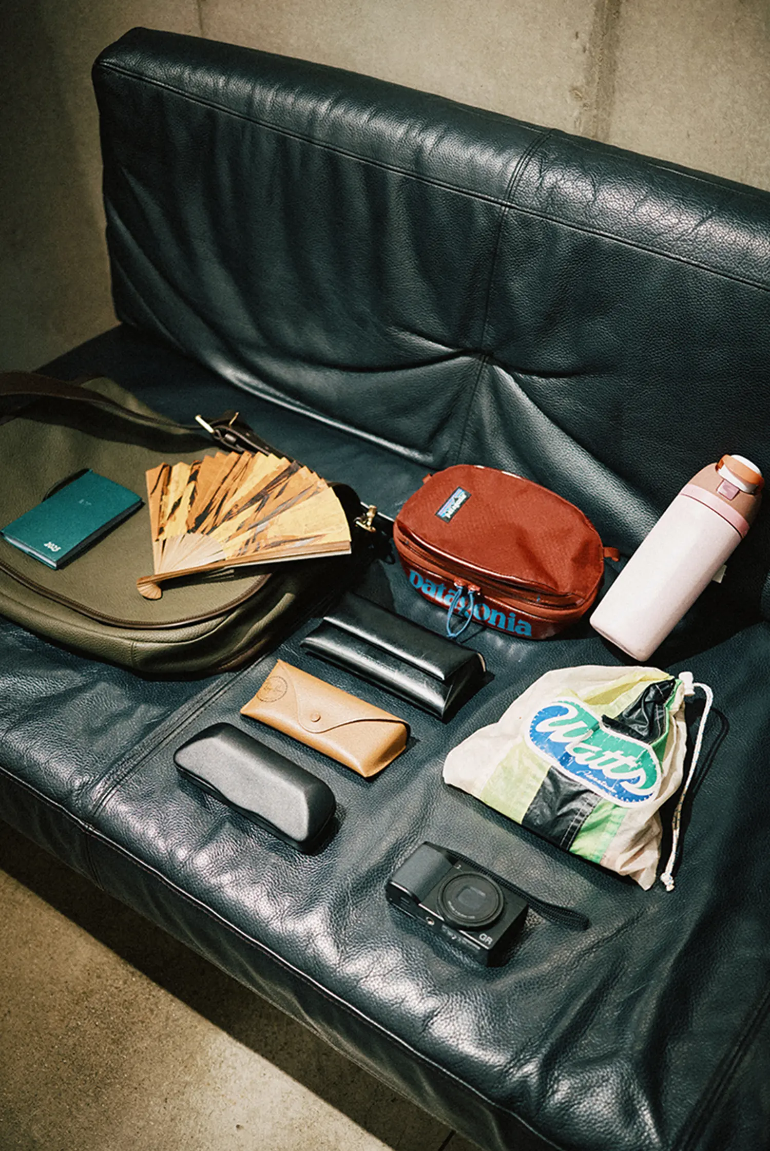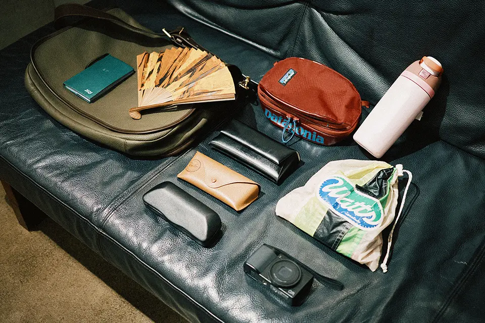 スマイソンの手帳やTomoka Nakaの扇子のほか、GRのカメラ、ヴィンテージの眼鏡など、吉田さんこだわりの私物がバッグの中に揃う