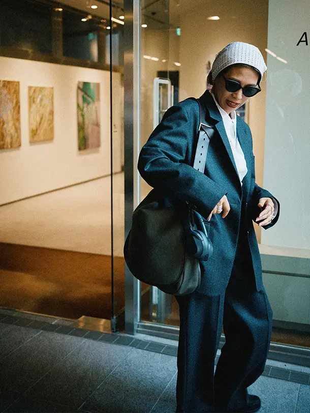 いつもは斜めがけして使うことが多いですが、今日はセットアップに合わせたので、ワンショルダーみたいに肩がけしようと思って。バランス的には重心が上にあるほうがいいので、ストラップを結んで短くしました。