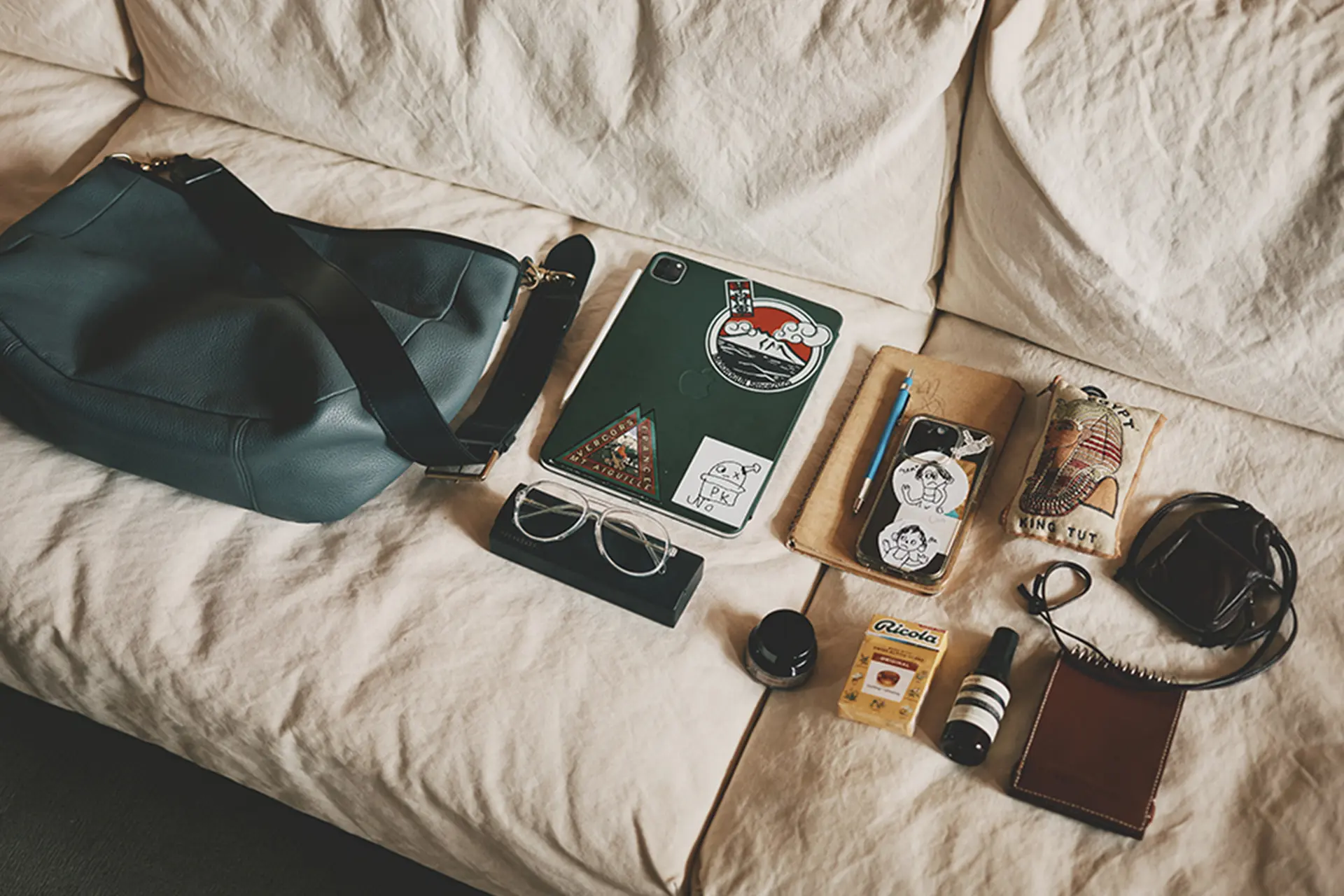 ステッカーやお子様が描いたイラストで彩られたiPadやノート、お財布やポーチ、眼鏡など、林さんの個性がさりげなく光るアイテムが並びます。