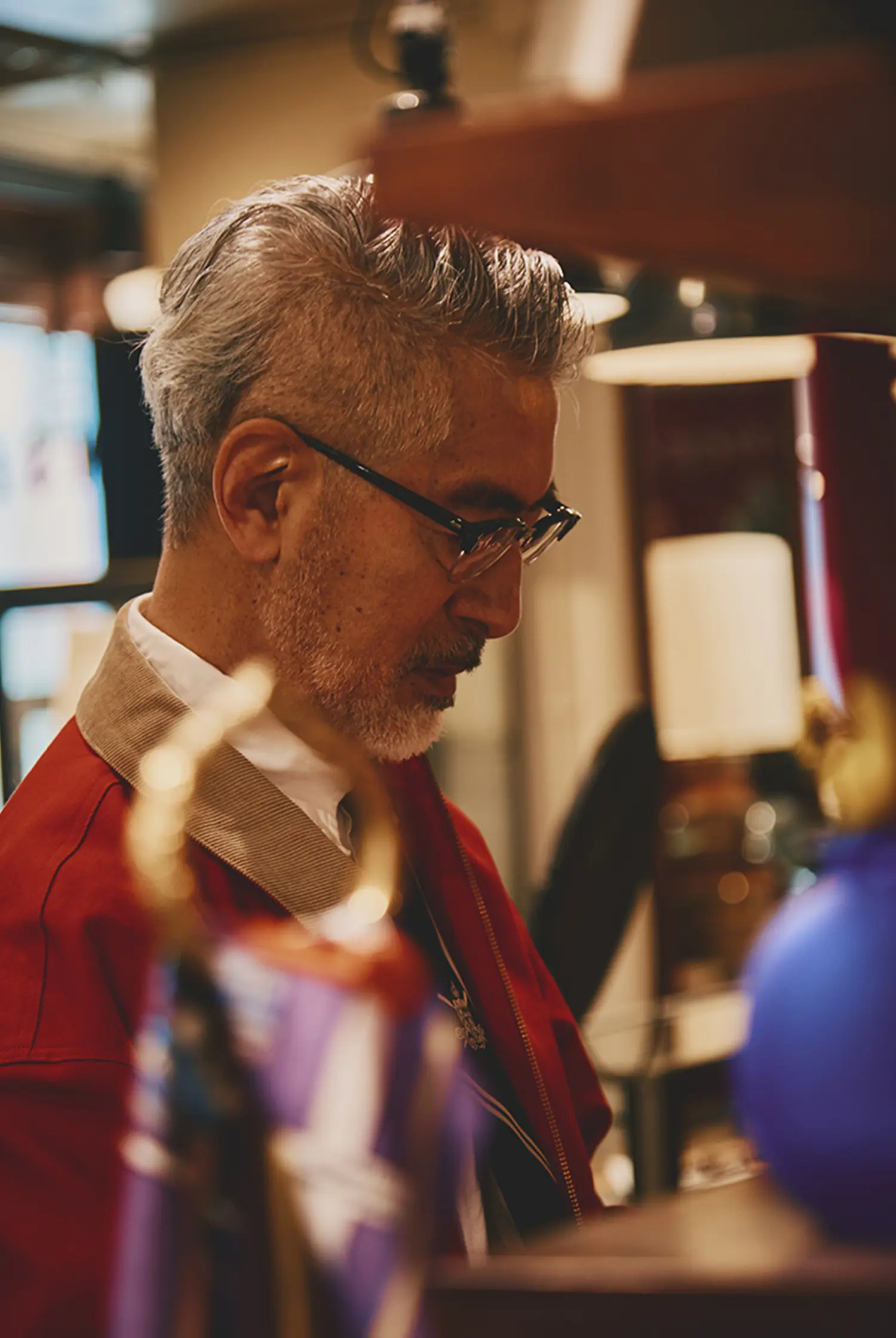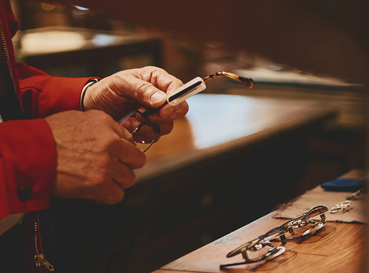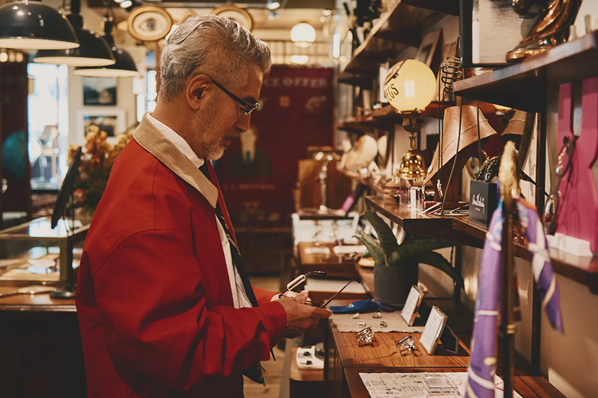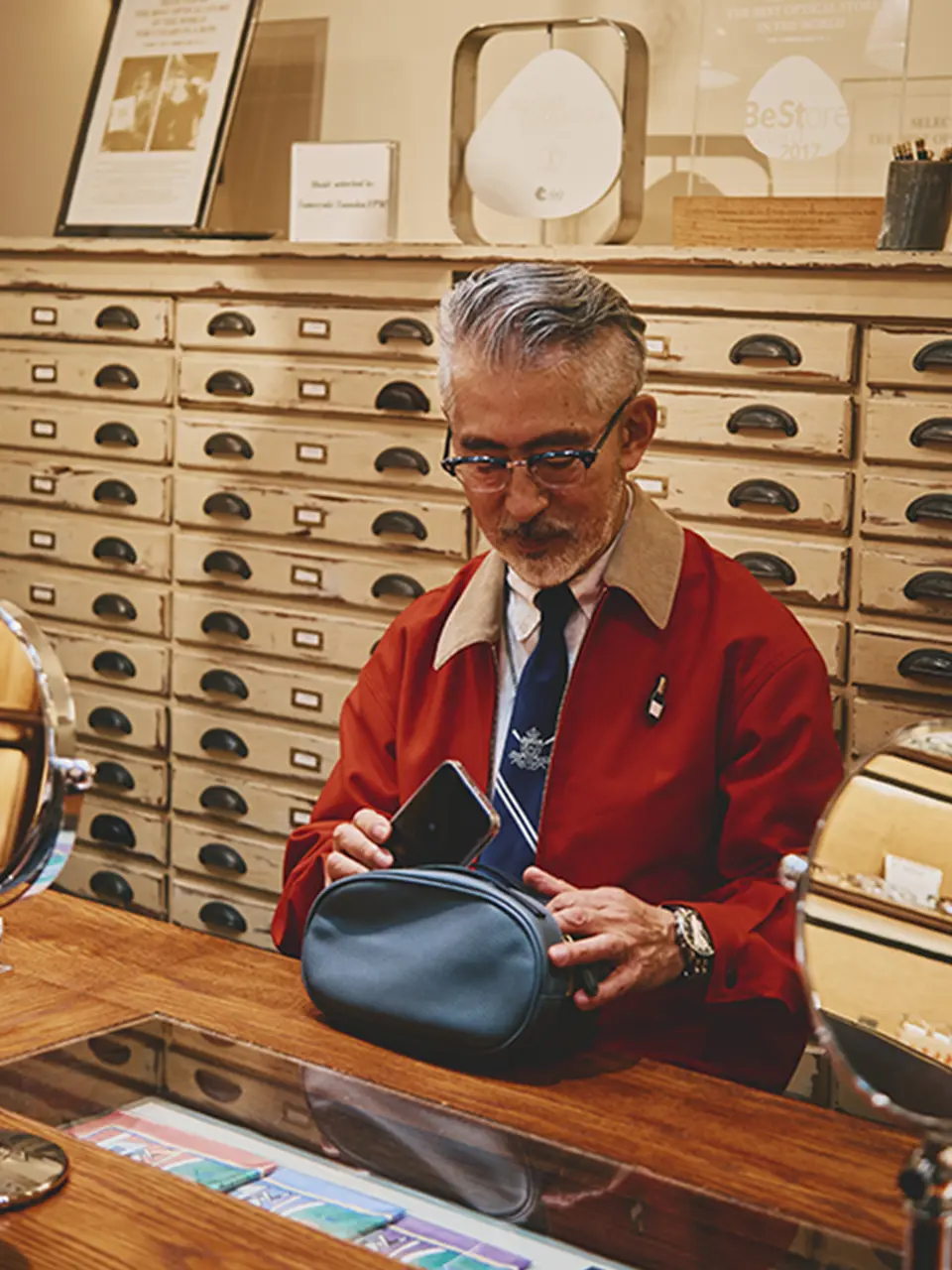 それと長年この仕事に向き合ってきた中、自分と異なる世代、異性、様々なファッションや職業の方々のお見立てをしてきたので「女性が掛けたらどうだろう? 」、「若い人たちが素敵に掛けてくれそうだな」と、自分の価値観とは別のベクトルでもアイテムを見るようにしています。その中で従来のメガネにはない新しい発想があるかどうかも大事にしていますね。