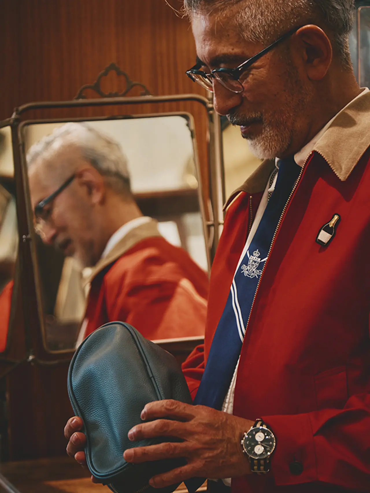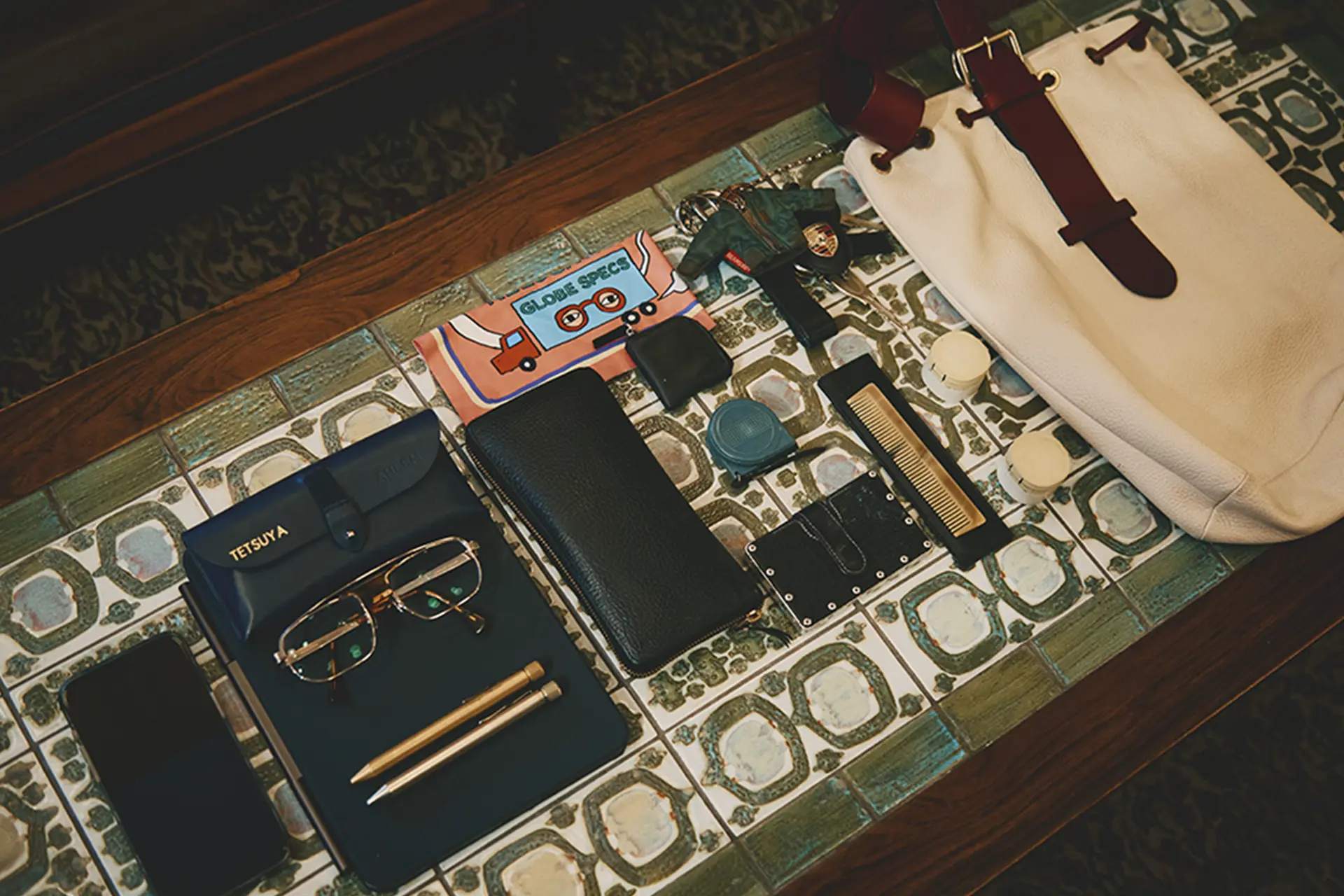 眼鏡やボールペンなどに加え、整髪料やコームも携帯。出会ったアンティーク家具のサイズを測れるようメジャーを持ち歩くのも、岡田さんらしさが表れています。