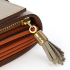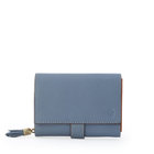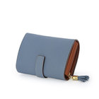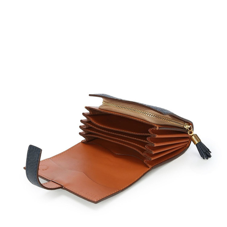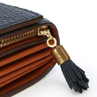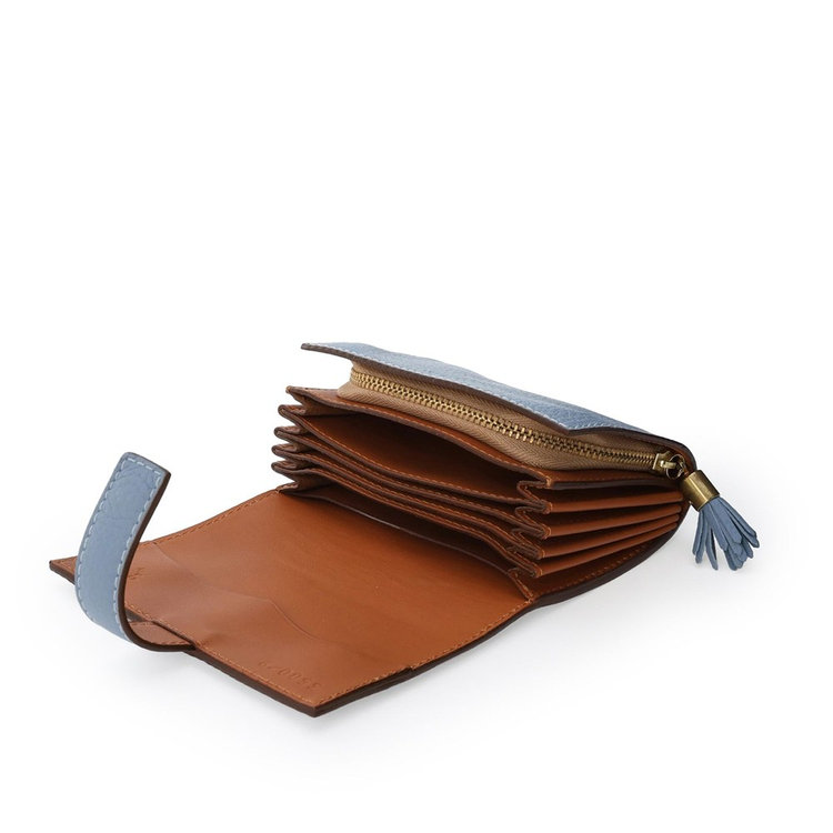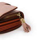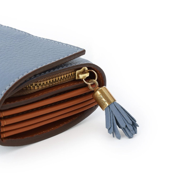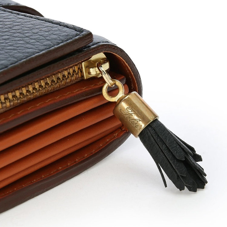 外装にはレザーフラップが付属。バッグの中でも収まりが良くなるほか中身の容量に応じて、スナップボタンで厚みを2段階調節できます。また、小銭入れの引手として配されたレザータッセルもアクセントに。実用性に加え自由度が高く、使い手のアレンジが利く財布です。