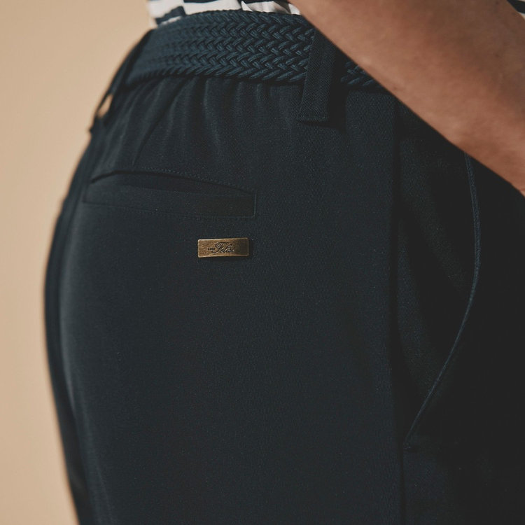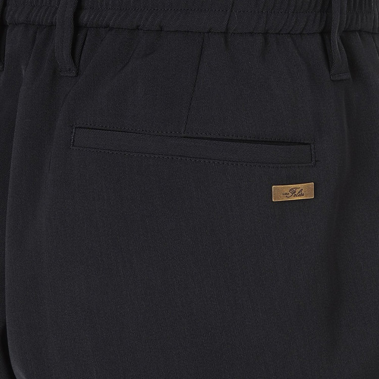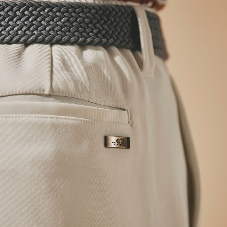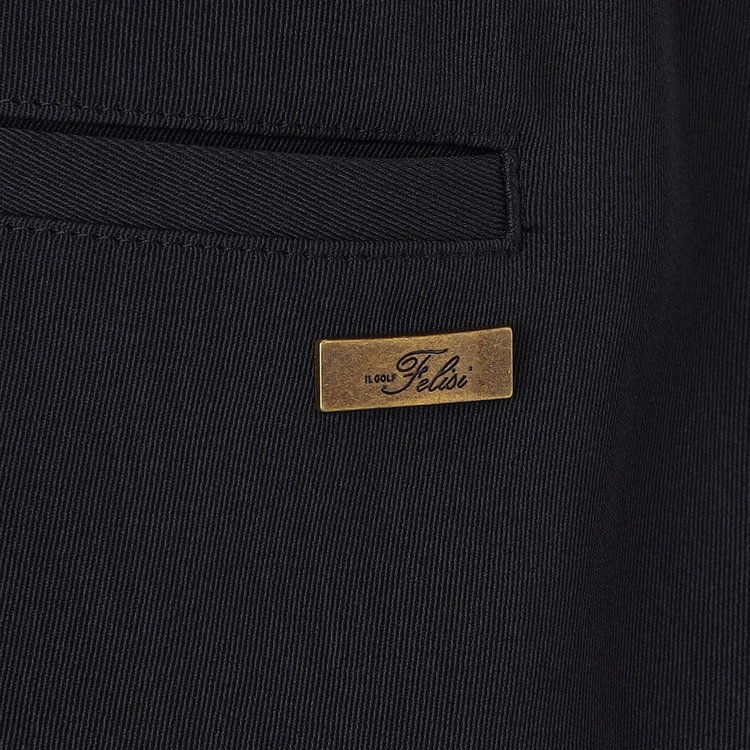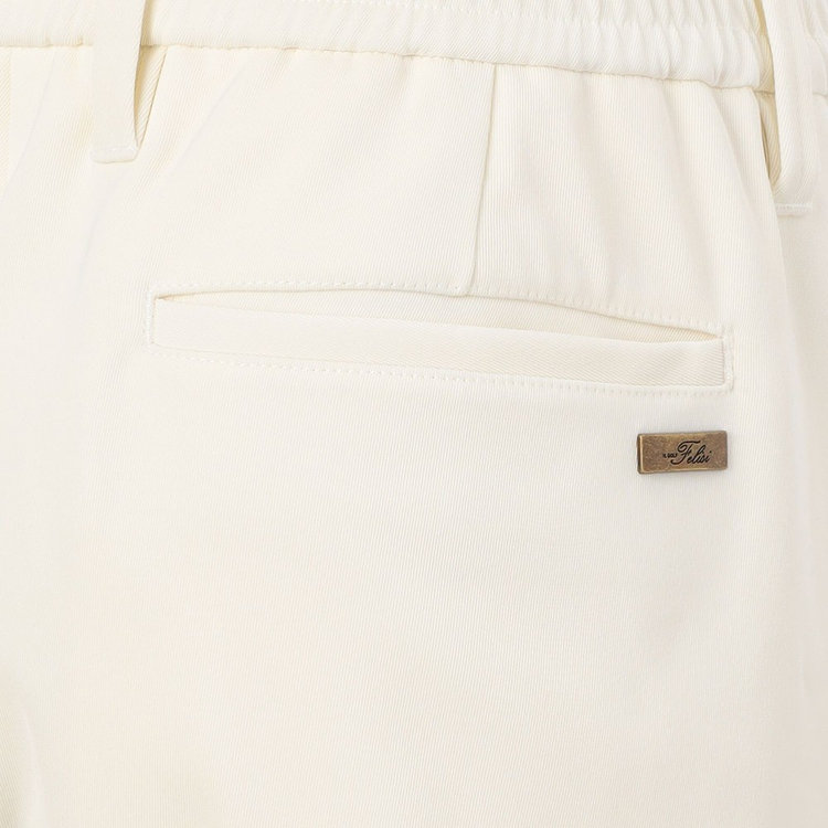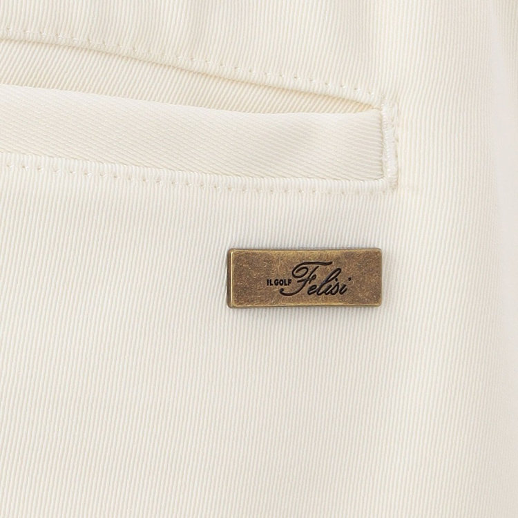 生地にはスポーティーさとドレッシーな印象を合わせ持ったポリエステル素材のカルゼを採用。シワになりにくく綺麗な印象を保ちやすい特性のほか、高いストレッチ性にドライな質感が相まって、ゴルフシーンのみならず春夏のオンスタイル、街着としても重宝します。バックポケットにはFelisi IL GOLF(フェリージ イル ゴルフ)のメタルプレートをあしらい、シンプルなデザインに華やかさを取り入れました。Felisi IL GOLFを象徴する、エレガンスを醸すディテールのひとつです。