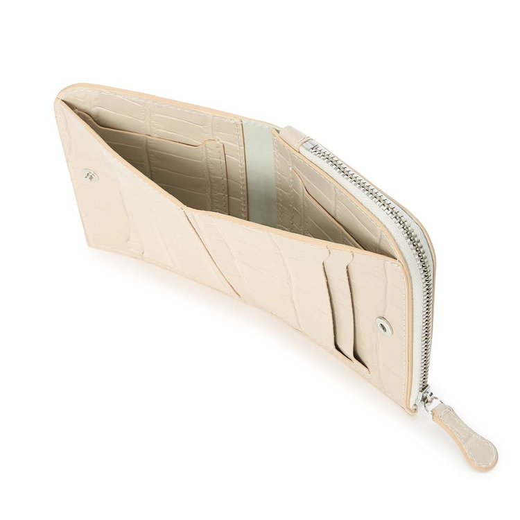 Felisiを代表する素材のひとつ、クロコダイルエンボスを施したカーフレザー。型からFelisiオリジナルで制作したエンボスを丁寧に施したレザーは、ベジタブルタンニン鞣しの後、さらに色付けとコーティングを施すなどの特殊工程を経て生産されています。そのため繊細で精巧な立体感、独自の発色の良さに加え、控えめな光沢感を放つのが特長。唯一無二の優美さを備えたFelisiエクスクルーシブレザーです。