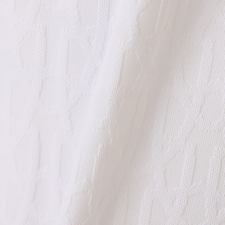 Felisiのモノグラム柄をジャカードで表現したオリジナルジャージー素材。ストレッチ性、吸水速乾性に優れるなど、ゴルフウェアとしての機能も持ち合わせています。程よい薄手、かつ軽いウエイトの生地のため着心地も快適。ジャカードはボディと同配色を採用しており総柄ながらも上品な印象で華やかなムードを添えてくれます。