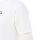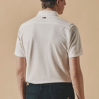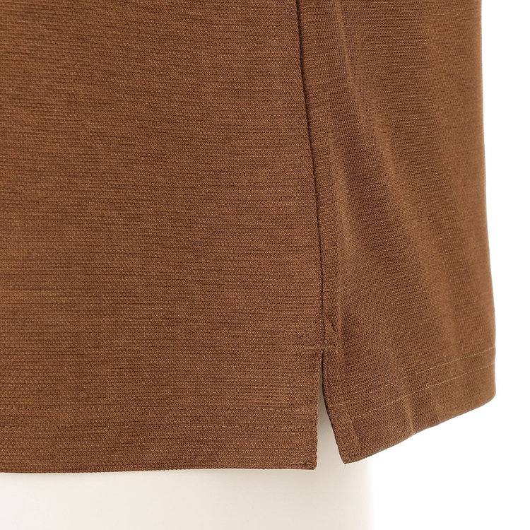 生地には麻のような軽やかな風合いのポリエステルを採用。特殊な撚糸と染色により自然素材らしさを演出した、こだわりの生地を選びました。春夏のスポーツシーンに最適な鹿の子のような清涼感ある生地の表情もポイントです。リゾート感がありつつも大人らしい落ち着きを実現してくれる品の良い素材使いです。