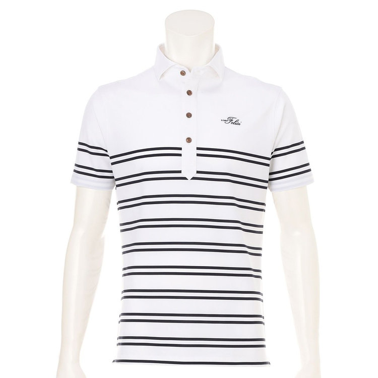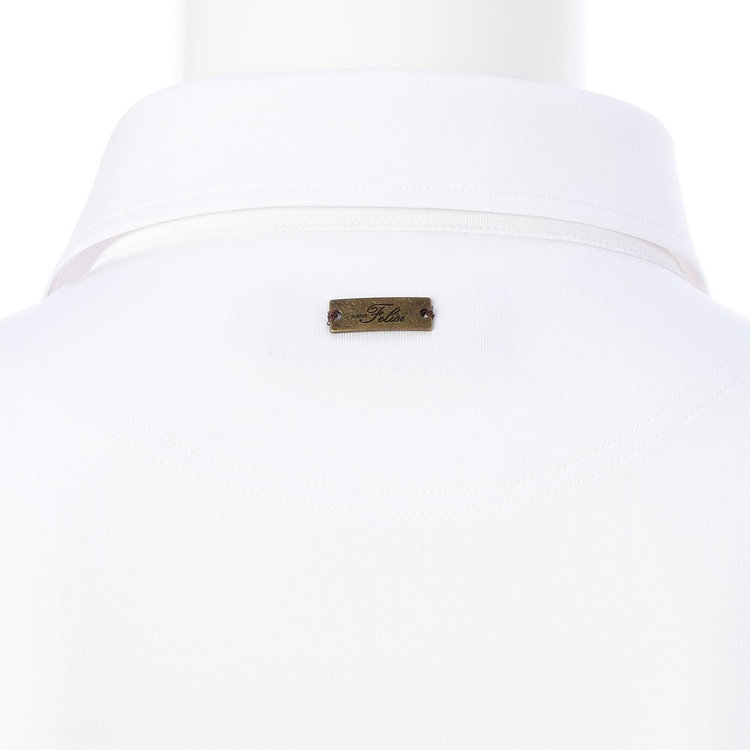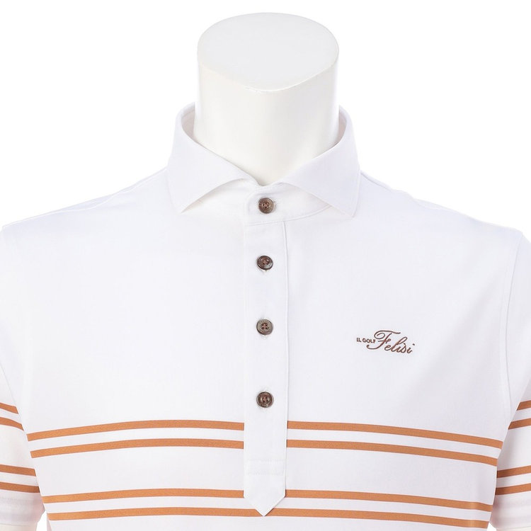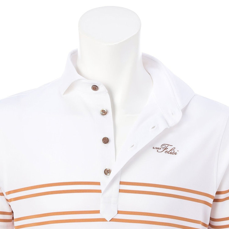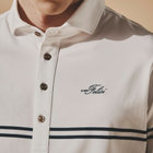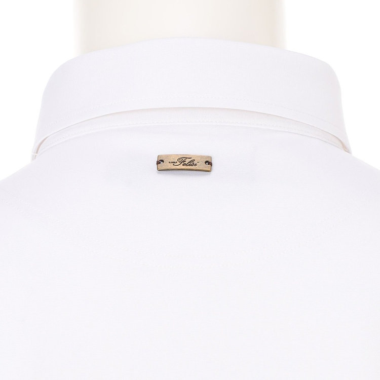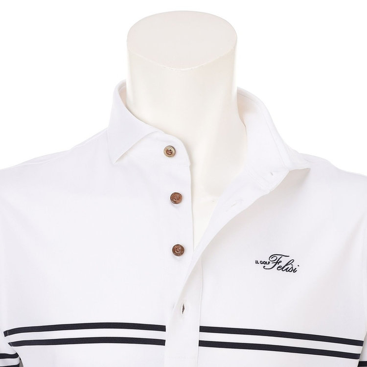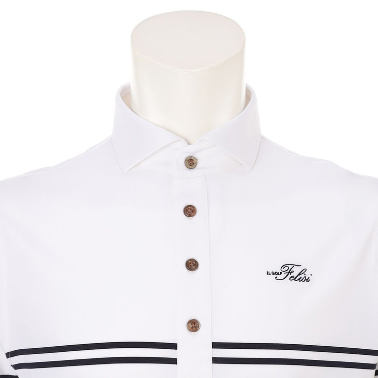 襟型にはイタリアらしいホリゾンタルカラーを採用。汎用性が高く様々なスタイルにマッチします。前立ては、一般的なポロシャツと比べて長めに設定しており、タックインしても様になるようバランスを計算しています。袖はカフではなくカットソーデザインを採用。袖まくりが簡単にできるようゴルフシーンでの使い心地を考慮しました。